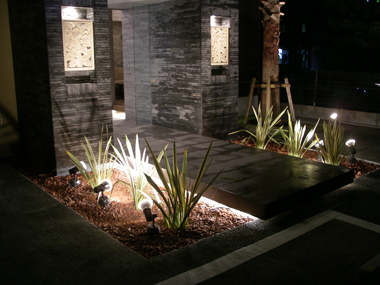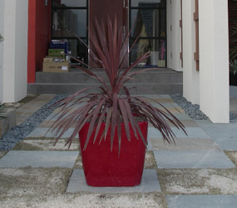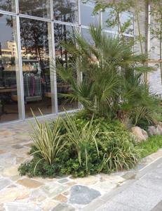 亜熱帯植物(露地植えでは育たないもの)や草花を植え込んだプランターをポイントポイントで配置すると、効果的なアクセントとなり、空間が引き締まります。