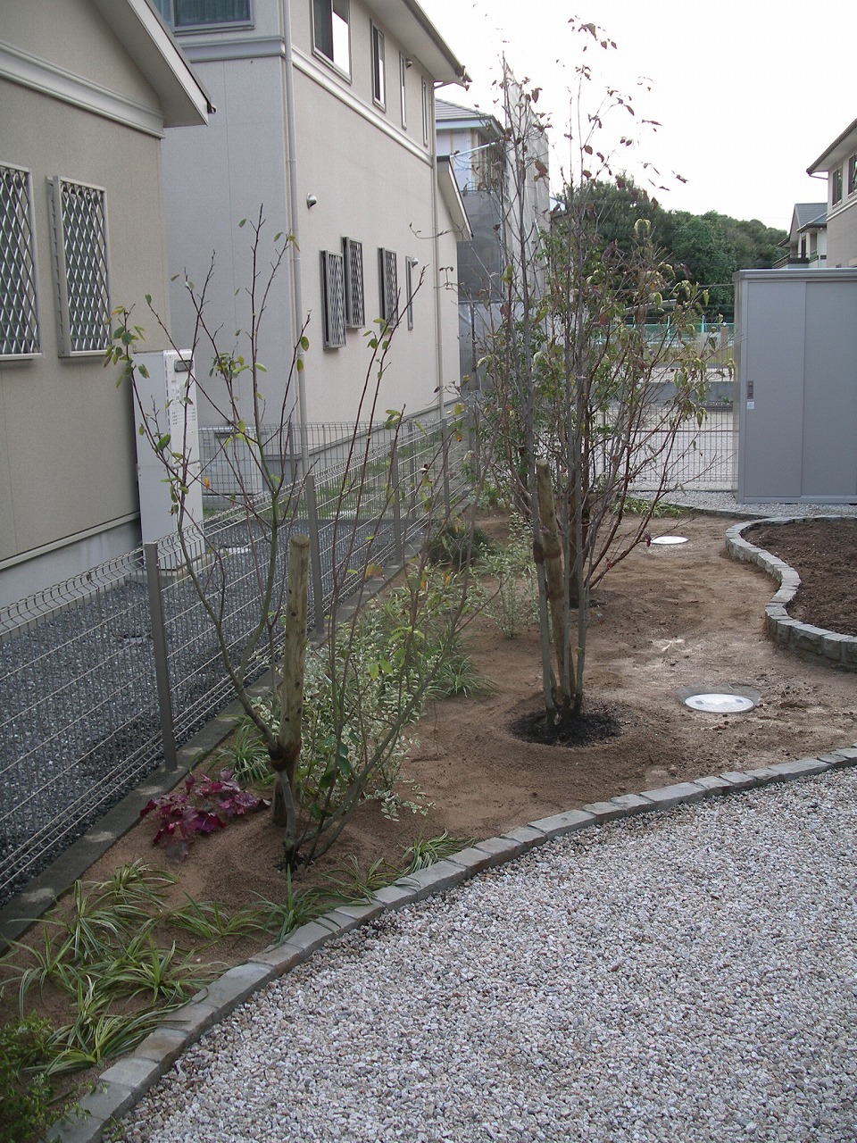 ビーンズの形をした畑を庭の中央に配置し、奥側に植栽を、建物側は砂利敷きを行いました。
