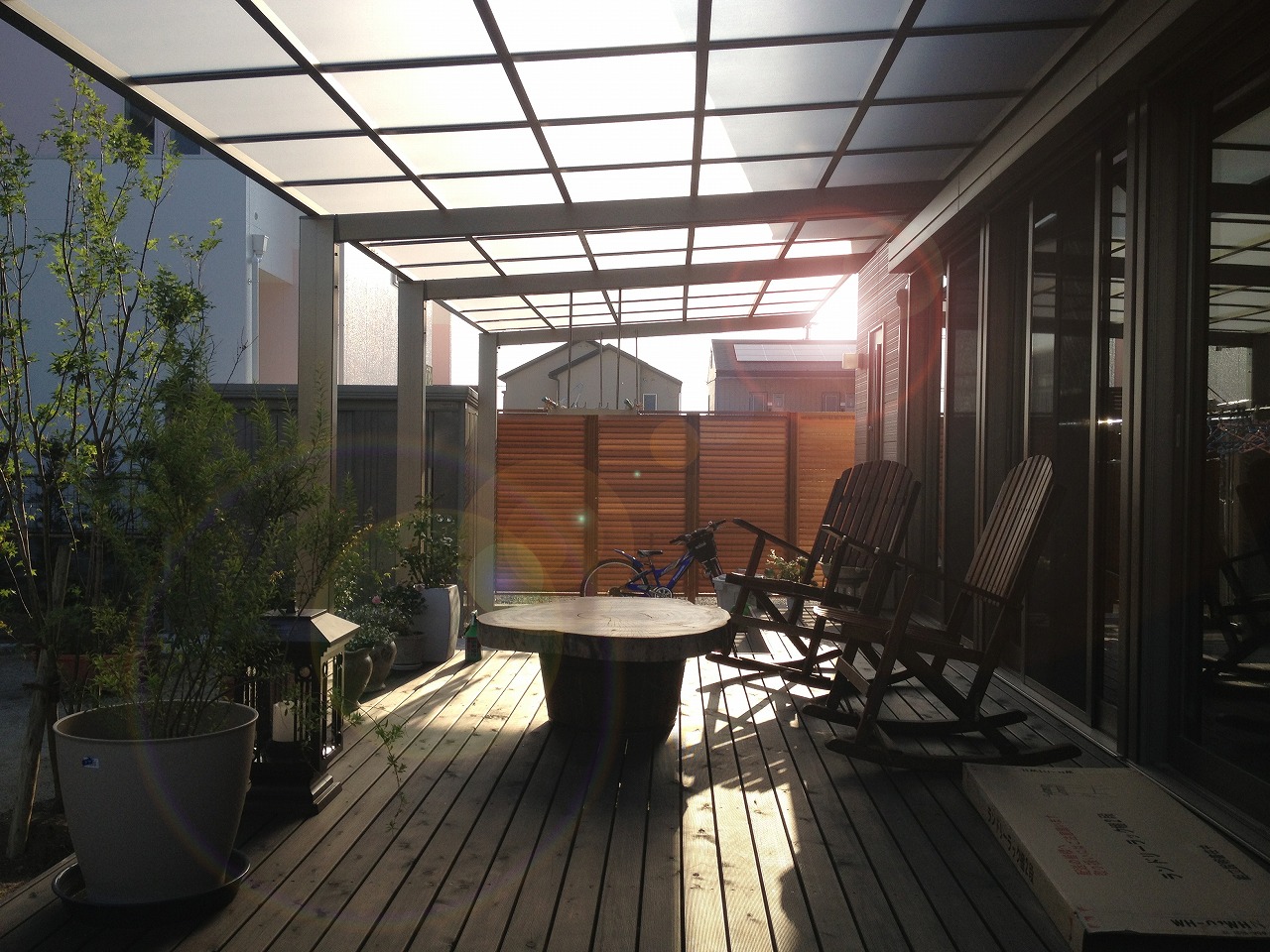 既存の広いウッドデッキがあります。庭にモミジをメインツリーとした植栽を行い、そのウッドデッキでのんびりと庭を眺めながら寛げる、そんな庭づくりを目指しました。樹木はスポットライトでライトアップし、夜でも楽しめる庭となります。 ぞのほか、そのウッドデッキにかけるテラス屋根、物置、カーポートなどの工事を行いました。
