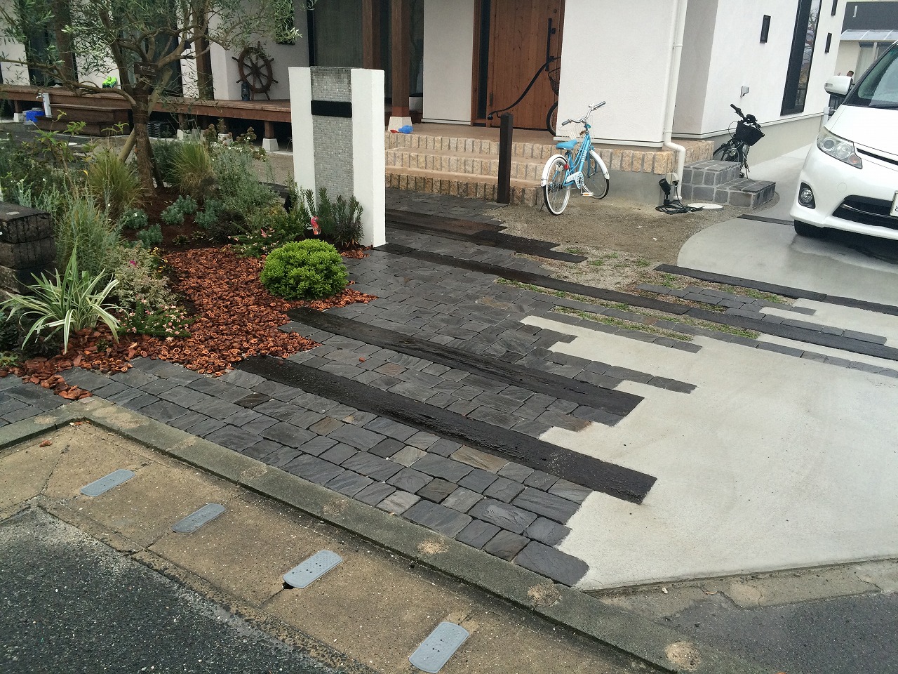 自然石と枕木を主材料として使った、ナチュラルな雰囲気の空間です。色合いは、ホワイトとグレイを基調としたシックなものとしました。 道路際の塗壁(白系)は、道路と庭を柔らかく仕切るアクセントとして、また周辺からの視線を遮る遮蔽壁として機能しています。