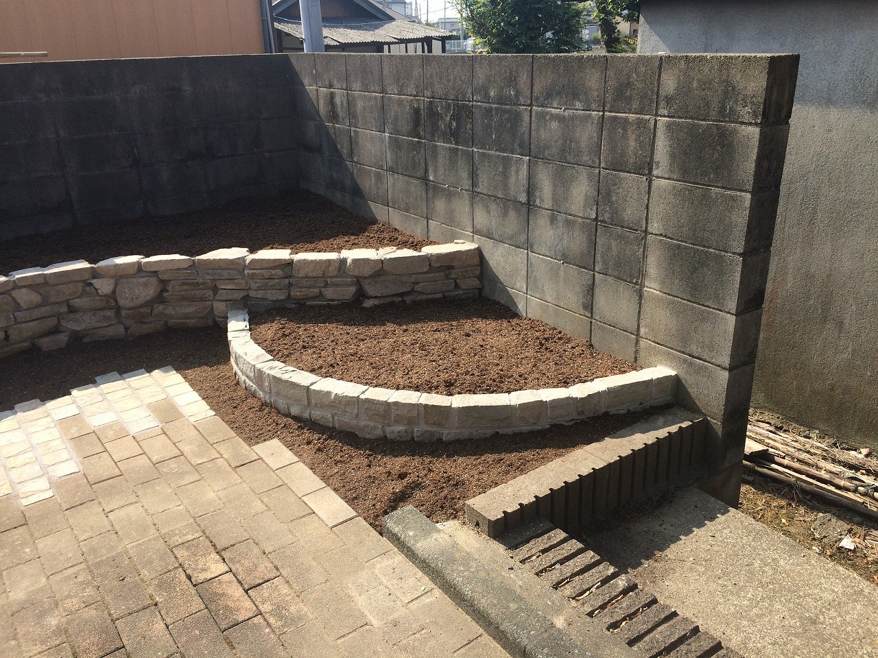 庭の一角にある花壇の改修計画になります。現在フラットになっている花壇を、自然石を使って高低差(最高400mm程度)を付ける立体花壇形態に改修します。 花壇内の植栽はTさんご自身でやられるということで、今回の整備では行っていません。