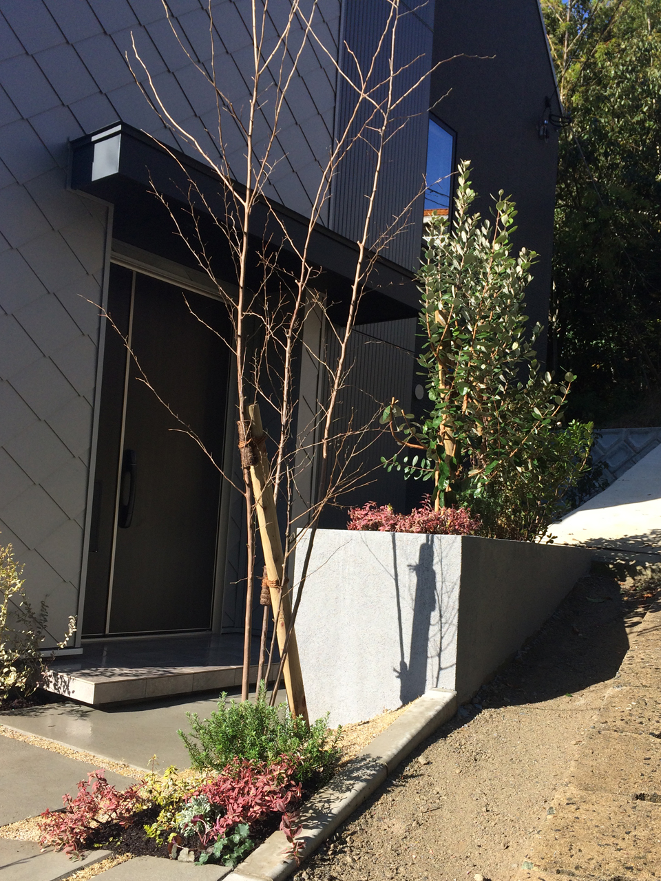 狭小地に建つ新築一戸建住宅(3階建)です。シンプルモダンな空間づくりを目指しました。 前面道路の勾配がきつく、高低差処理・アプローチ路のすりつけに苦心しています。