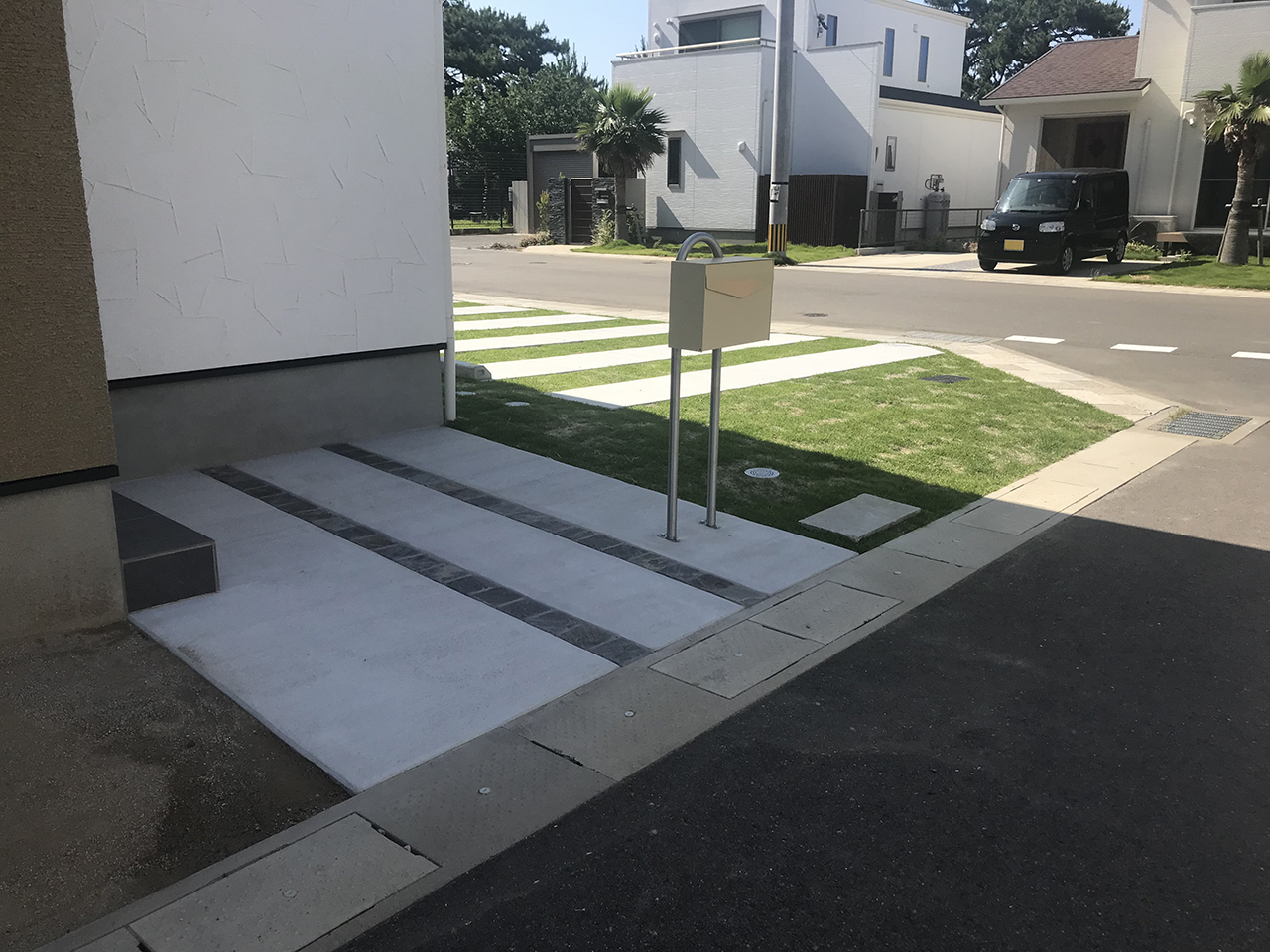 芝生とコンクリート舗装との規則的に構成されたデザインが美しいコントラストを形成しています。