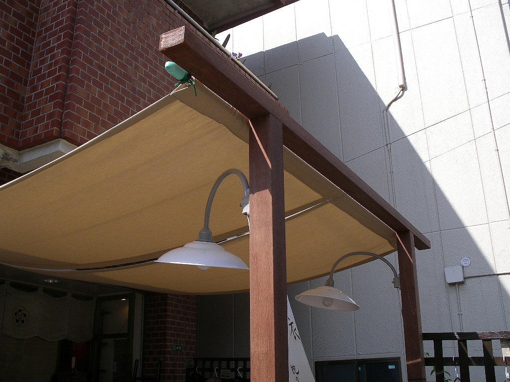 外でランチやお茶を楽しめるテーブルをつくりました。そのテーブルの脚(片側)をばして、日よけターフを設置、伸ばした柱にアンティークな照明を取り付けました。
